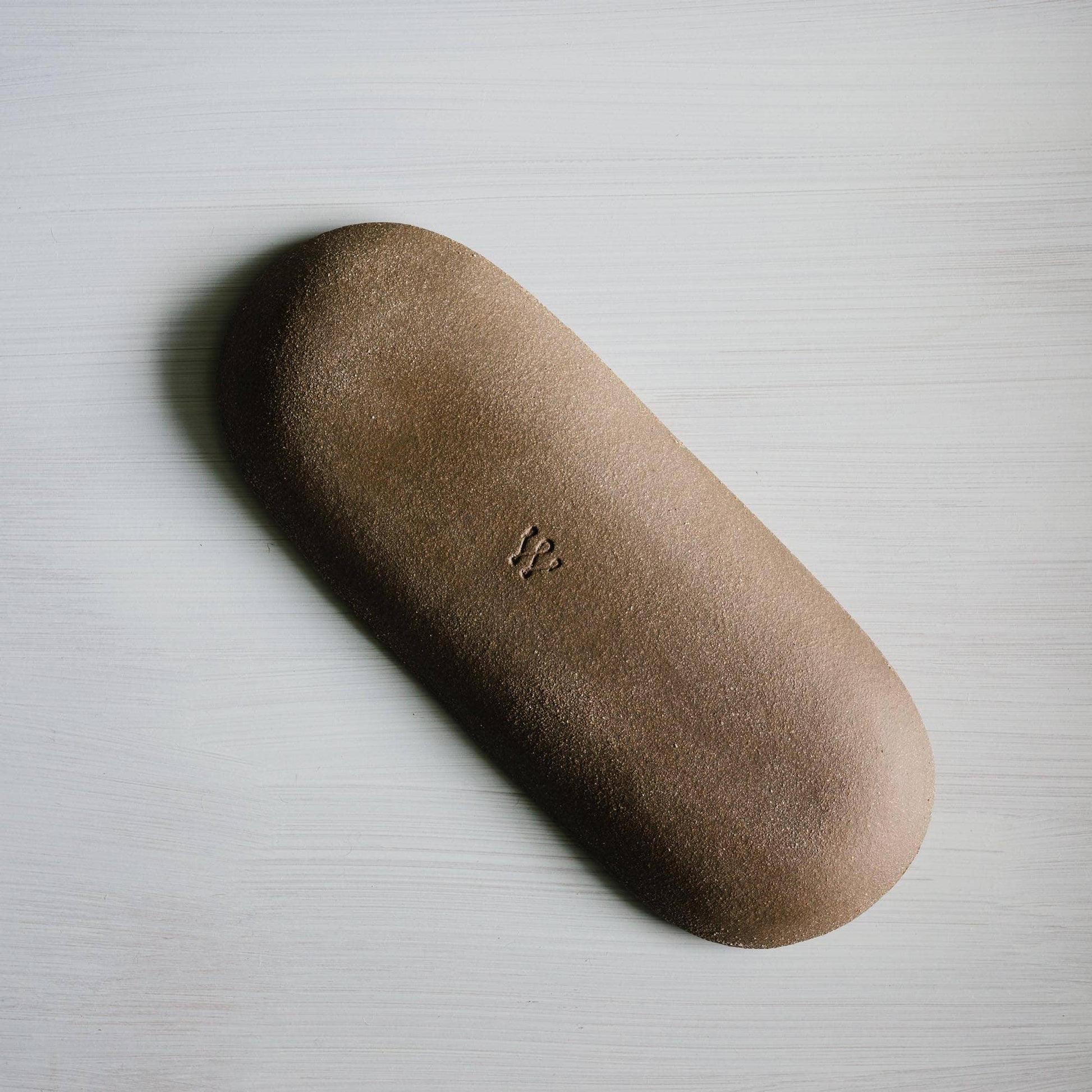 Handcrafted ceramic platter measuring 31.5cm x 13cm, designed and made in Australia by Julia Denes. Crafted from natural stoneware with a glazed finish, available in Eucalyptus, Midnight Blue, or Salted Cocoa. Each piece is individually unique, showcasing raw natural texture and form. Ideal for serving or display.