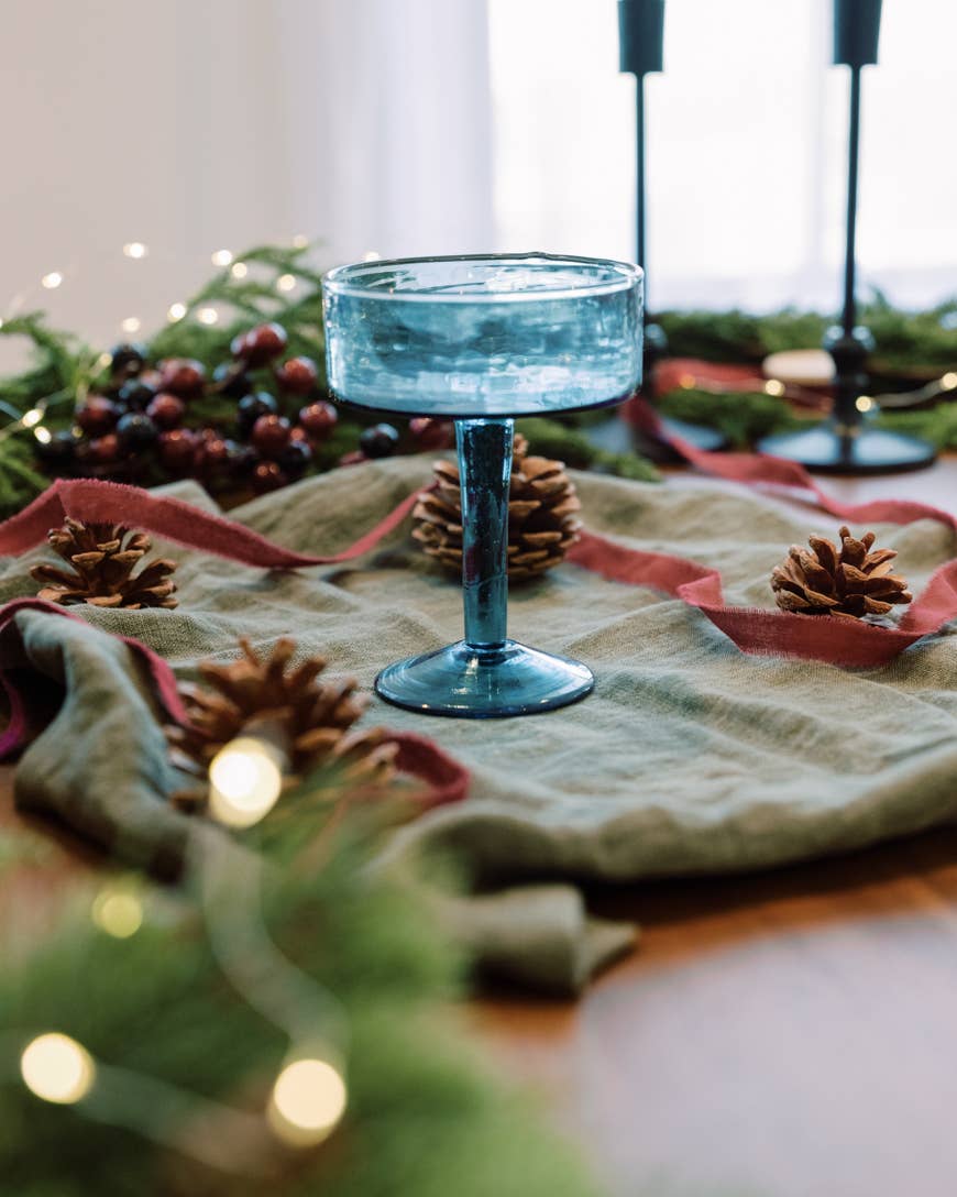 Handblown coupe glasses crafted from 100% recycled glass with a distinctive hammered texture. This pair features colored glass throughout—not sprayed—ensuring lasting vibrancy. Each 8oz glass is ethically made at a woman-owned business in India. Dishwasher safe and perfect for cocktails or mocktails. As handmade pieces, slight variations are natural.