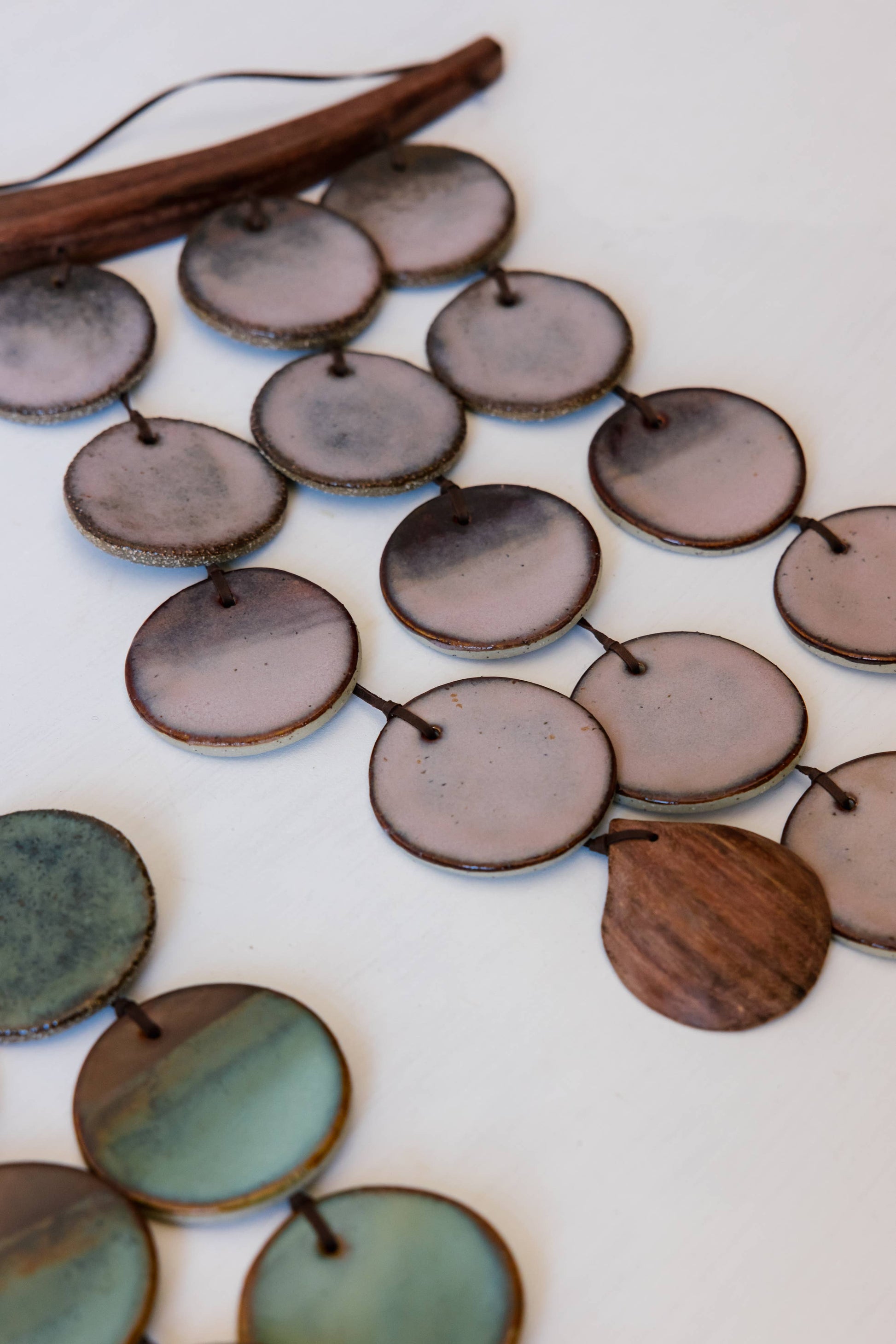 Handcrafted ombre wall hanging featuring natural wood and ceramic stoneware elements suspended on naturally dyed leather cord. Measuring 7.87 x 22.44 inches, this unique piece works beautifully as an indoor wall feature or outdoor wind-chime. Designed and made in Australia by Julia Denes in partnership with skilled Nepali artisans, each piece is one-of-a-kind with subtle variations that celebrate its handmade nature.